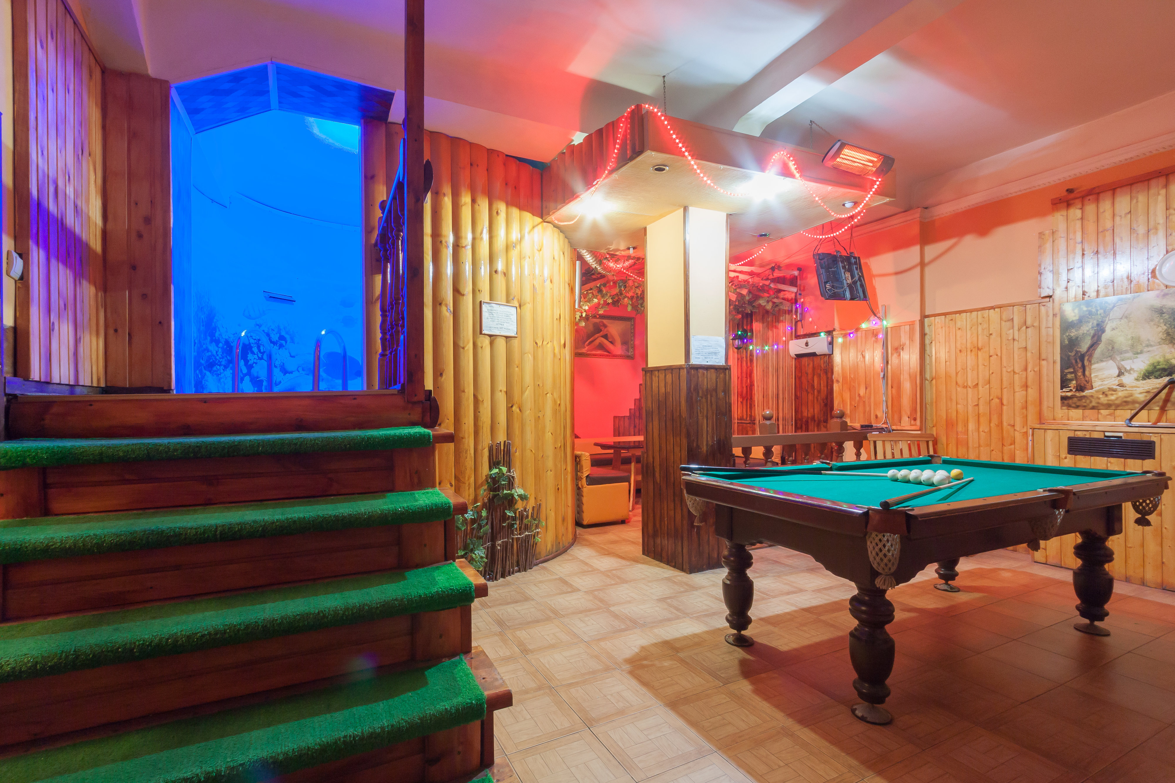 Не хочется в бассейн? Не беда! Вместо этого можно передохнуть в нашей комнате отдыха. Мы ставили своей целью создать здесь уютный, практичный интерьер из преимущественно натуральных, безопасных материалов, подобрать мебель, которая будет в равной степени удобной и приятной глазу. Надеемся, что вам понравится! Для поддержания атмосферы отдыха мы можем предложить вам бильярд, кальян и караоке. Также у нас имеется бар, где вы можете приобрести блюда русской кухни, а при необходимости прийти и со своей едой - мы не возражаем! Главное помните, что плотная трапеза незадолго перед посещением парной - это не самая удачная идея, по мнению терапевтов. А вот после парной - совсем другое дело!